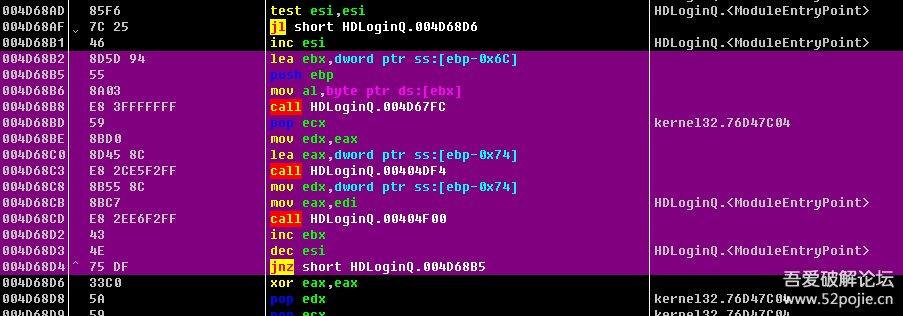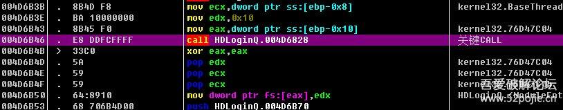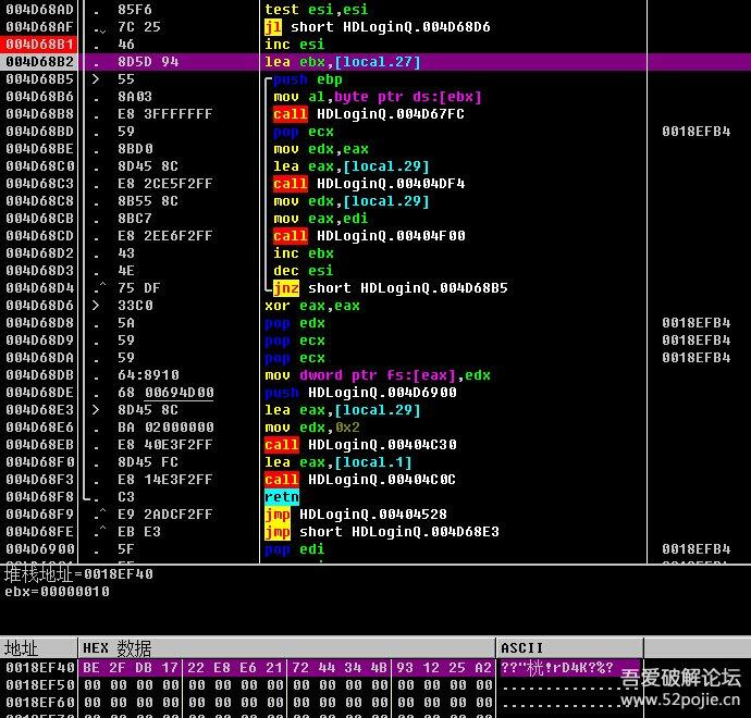 这时我们需要使用OD载入原版本程序,设置 004D68B2 处断点,运行程序到代码处会暂停,此时程序窗口还没有启动,注册观察EBX值为6