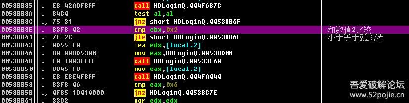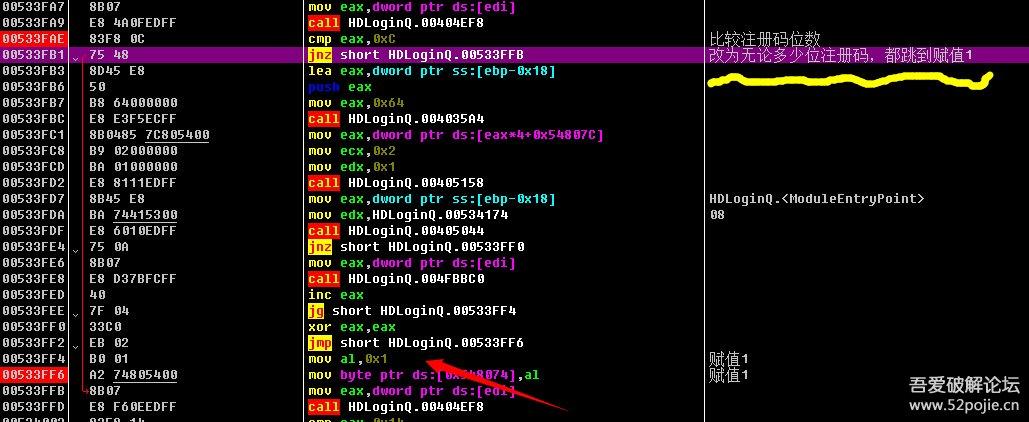 第3处,此处分析代码,初步本地验证注册码,我们直接强制跳到赋值1处 即 jmp 00533FF4
