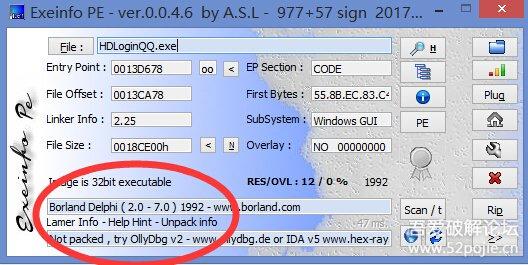 使用ExeinfoPE查壳,发现程序无壳,为Delphi编写程序
