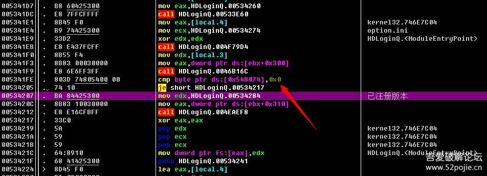 第5处,比较数值,没注册版本跳转,我们这里直接把JE行NOP掉,让它永远是注册版本哈