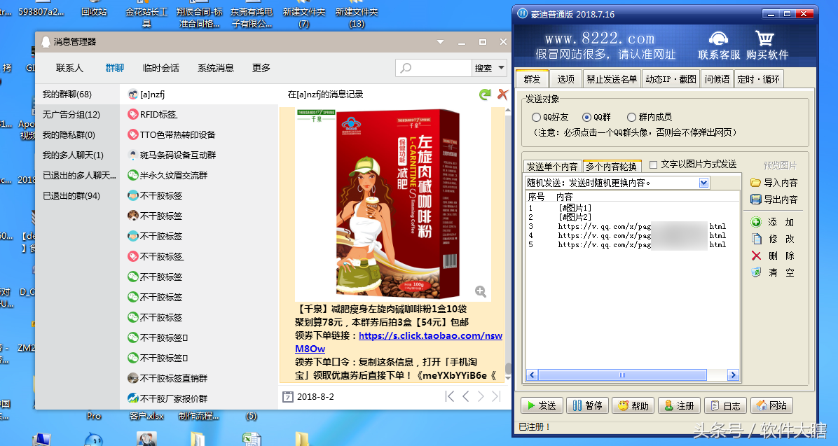 软件包里直接打开“直接启动变异版本即可”。QQ界面左小角,点开消息管理,如上图左侧,选择群聊。点开不需要发送广告信息的群,弹出对话框,在群发软件禁止发送名单界面勾选确认。软件回到群发界面,点“添加”按钮,加入文字、图片或链接内容。准备完毕,点击发送按钮,自动操作。计数君统计数据