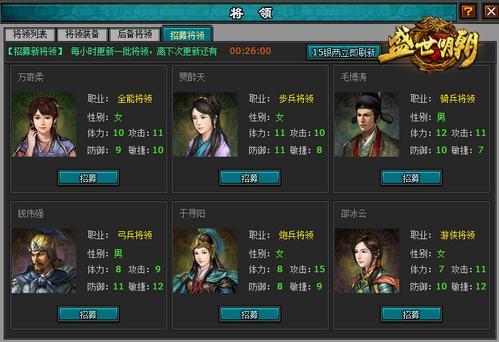 千金易得,一将难求!在4399《盛世明朝》中,你不再是单枪匹马的独行侠,而是化身大明王朝一位带领千军万马的统帅,拥有一支强大的军队,才能踏上雄霸天下的征途!【将领系统】满足你招兵买马的需求,在这里你可以尽揽英雄豪杰,步兵、骑兵、炮兵等六种属性将领正等待你的征召!