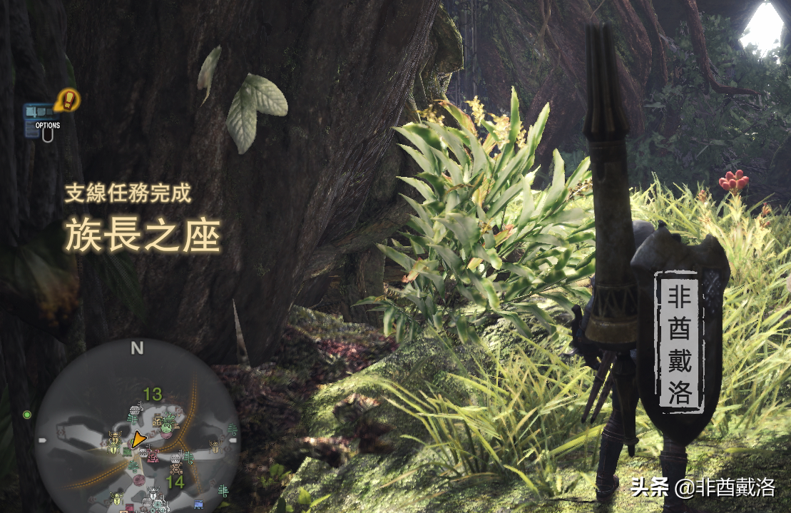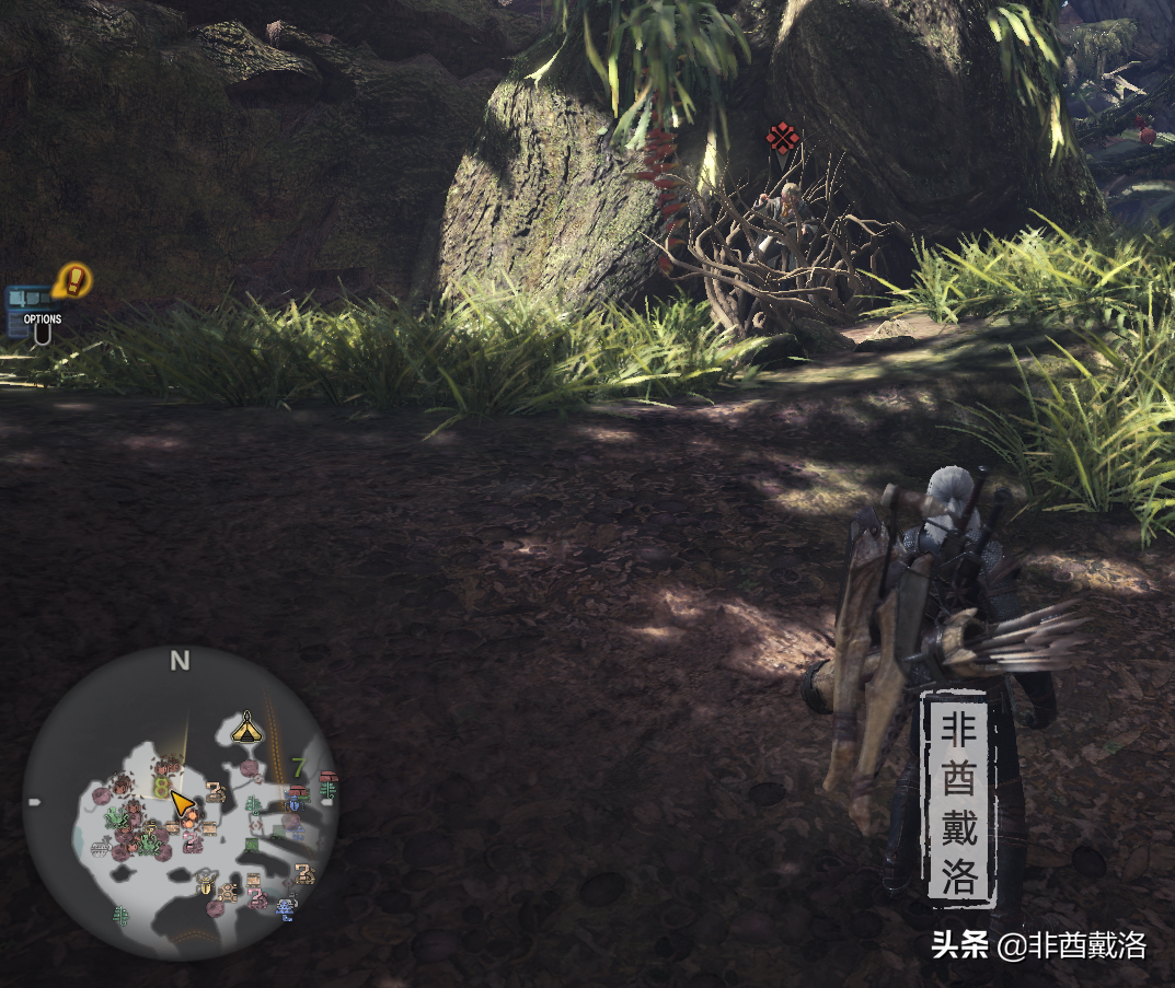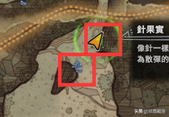 PS:这里需要注意一下,旁边就有一个【青菇】和一个【针果实】采集点,【青菇】最好采一下,【针果实】就看是不是用弩了。反正都在路上,顺道采一下就好,以后有用。后面的话,玩弩的猎人就注意一下地图上有没有【针果实】和【着火果实】,接下来就不再一个一个地提了。