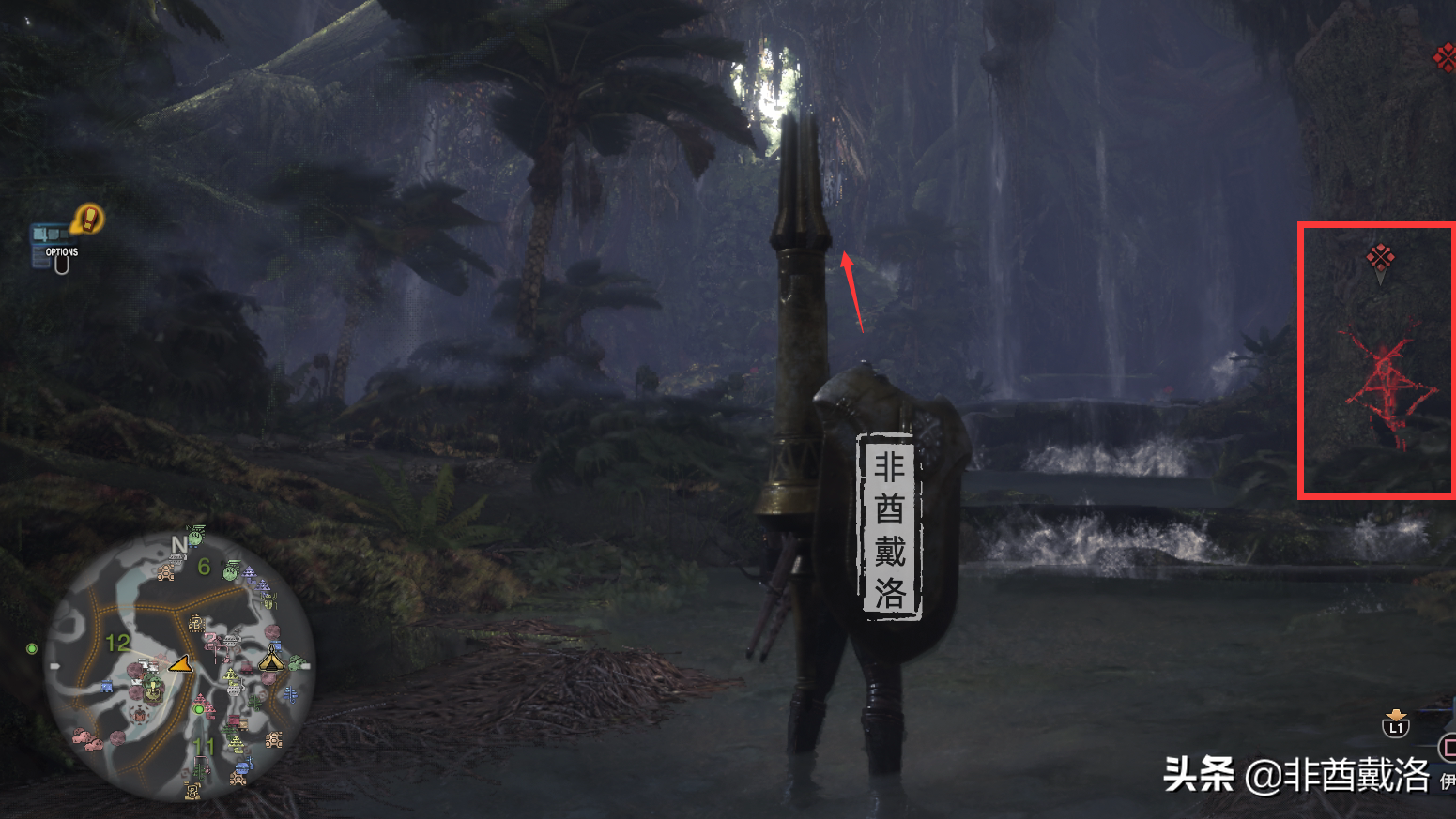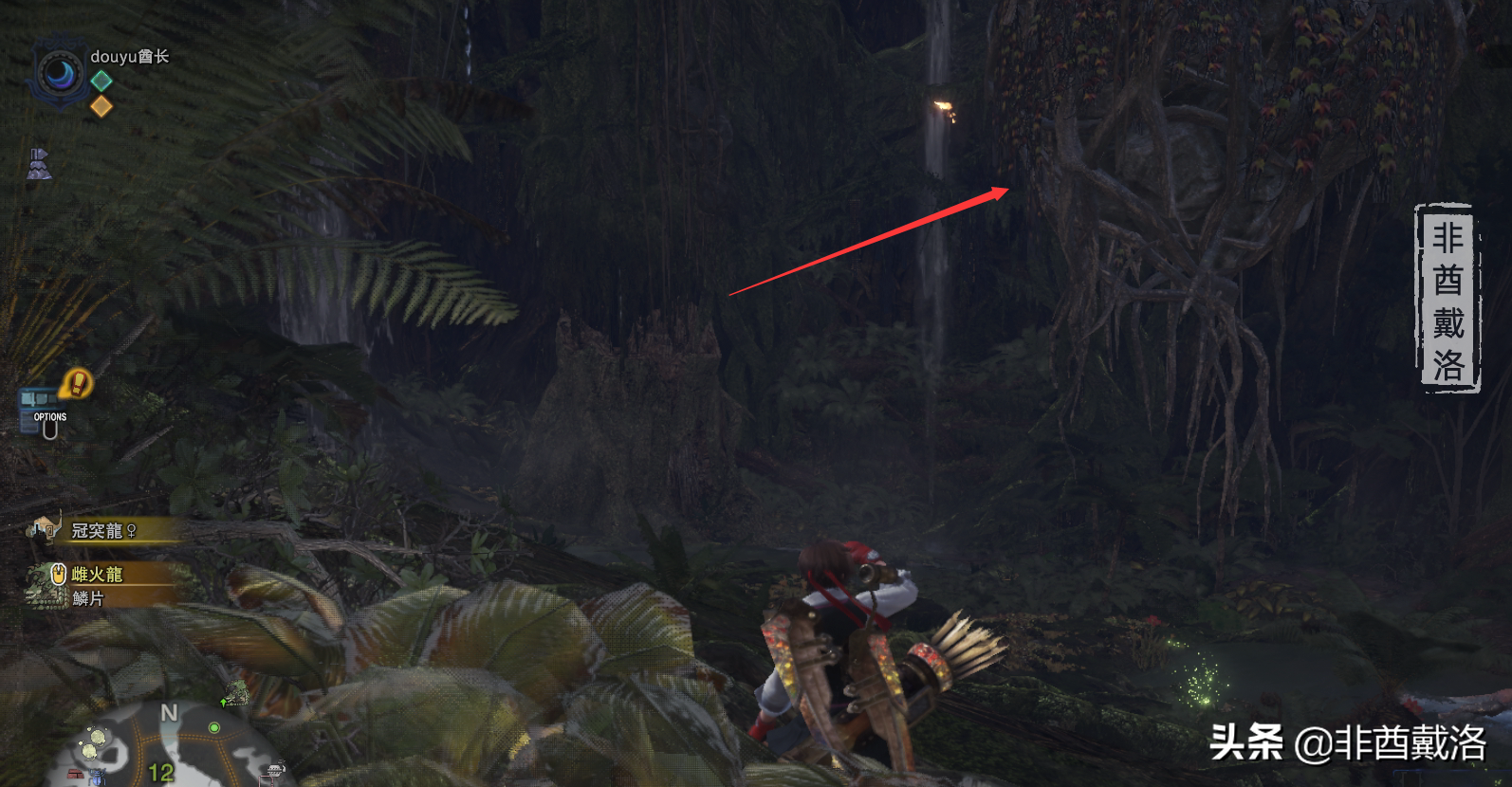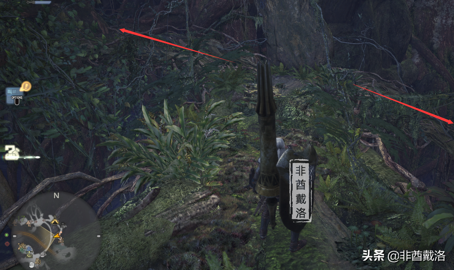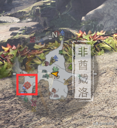 一路前行,来到下图的位置之后,会触发剧情,之后会来一群小凶豺龙,但是这里可以先不用管,朝着下图的箭头方向走就可以了(下图中红框的地方先不用管):