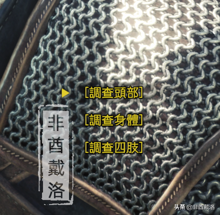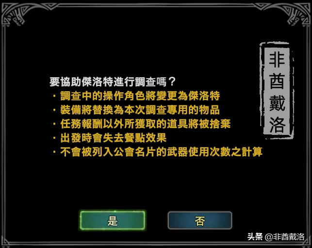 往上图中红框的地方前进(上面的标记我们先不管),看到草食龙尸体和NPC,与之对话之后会触发调查剧情,显示对话选择: