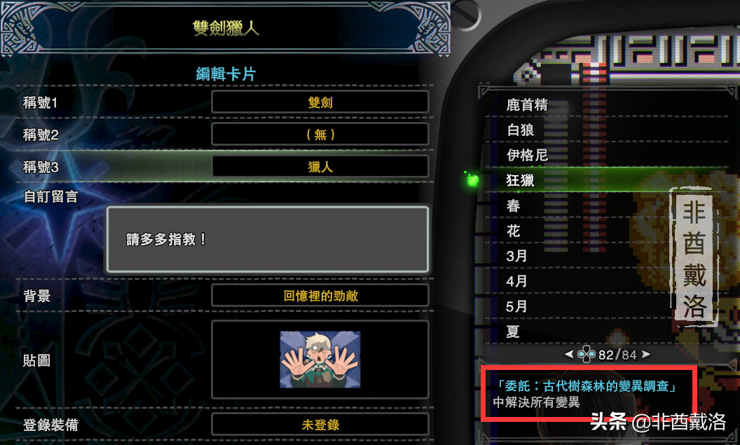 而如果在一次任务中同时完成【族长之座】和【濒死的毒妖鸟】这两条支线,并最终讨伐鹿首精的话,可以获得【狂猎】称号——可以在公会名片中编辑: