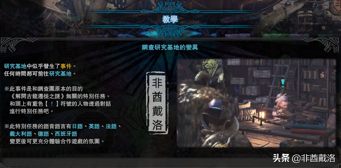 本攻略不会涉及到剧情解析。因为这次联动,怪物猎人世界将会结合巫师3的RPG玩法开展一种新的游玩方式。因此,为了保证各位的体验,攻略中将会尽量避免剧透;本攻略并不代表着绝对正确,仅供大家参考;本攻略的重心将放在完美获取所有能获取的必要东西上面,而不是竞速;本攻略不包括后续5月17日的【古代鹿首精】。前置剧情