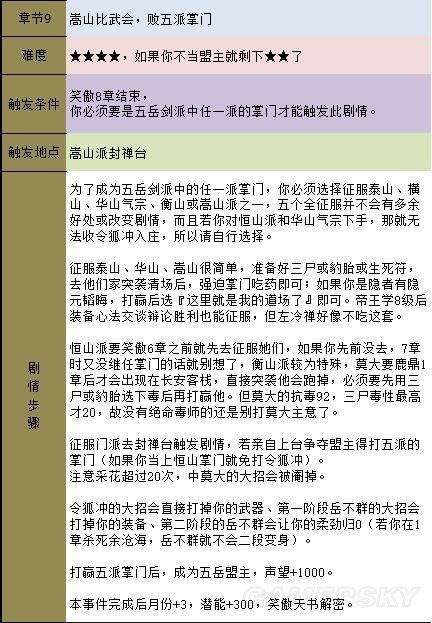 五岳并派 →赴嵩山参战→全场战胜→得五岳盟主称号。