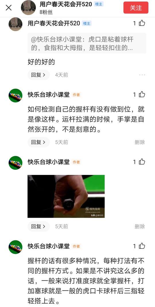 这个时候,你去问一下那些台球高手,他们肯定也愿意回复的,就像老师一样,有水平的问题谁不喜欢回答。