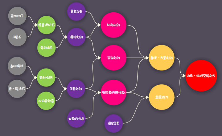 在我的模拟经营类游戏的引导体系分析中,将融合类价值链称之为素材引导体系。为了感受这一点,不妨设计一个简单的装备合成树来感受一下。下图是我设计的装备合成树,当然,所有内容都是完全虚构的。