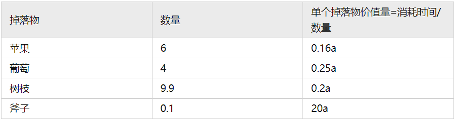 单从数量的角度来看,最廉价的是树枝,最稀有的是斧子,但此时加上一个限定条件,即如果刷副本A所消耗的时间为a,刷副本B所消耗的时间为b,结果就完全不一样了。一旦消耗的时间未知,那么能确定的只有苹果和葡萄的关系,树枝和斧子的关系,只有当消耗的时间确定下来,才能够确定这四个道具的价值关系。