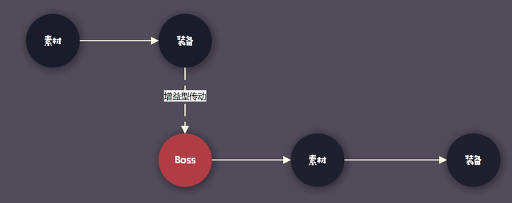 考虑这样一个游戏,如果希望打败BossA,需要制作装备A,那么是否能说,装备A连接到了BossA以及BossA可产生的各类素材。从广义上来说是可以的,但不妨为其赋予一个新的称呼,叫做增益型传动价值链模型。和朴素传动的区别是,增益型的价值链传动往往不是严格的连接关系,所以可以用虚线连接被增益的节点。