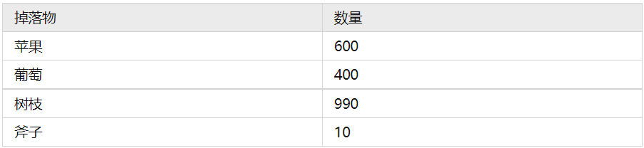 假设现在开发者创建了一个游戏副本,暂且称之为A副本,里面会生成10只怪物,每只怪物有60%的概率会掉落一个苹果,有40%的概率会掉落一串葡萄。再创建一个新的游戏副本,暂且称之为B副本,里面会生成10只怪物,每只怪物有99%的概率会掉落一根树枝,有1%的概率会掉落一把斧子。于是我们可以建立起一个表,统计玩家各刷100次AB副本后,获得掉落物的期望结果