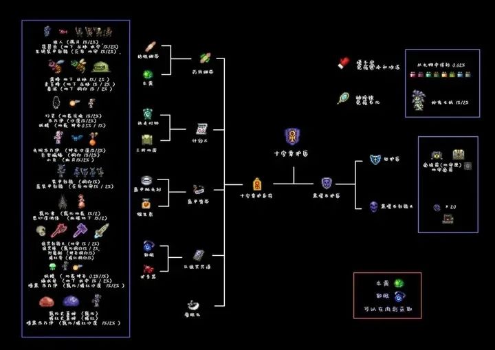 一个带有此类装备衍生结构的游戏往往引导性非常强,其价值链基本上代表了玩家的最有可能的行为路线。而拥有这样设计的典型游戏比如泰拉瑞亚,泰拉瑞亚的就基本采用了基于素材的引导体系,因而赋予了更多的从小到大的合成路线。