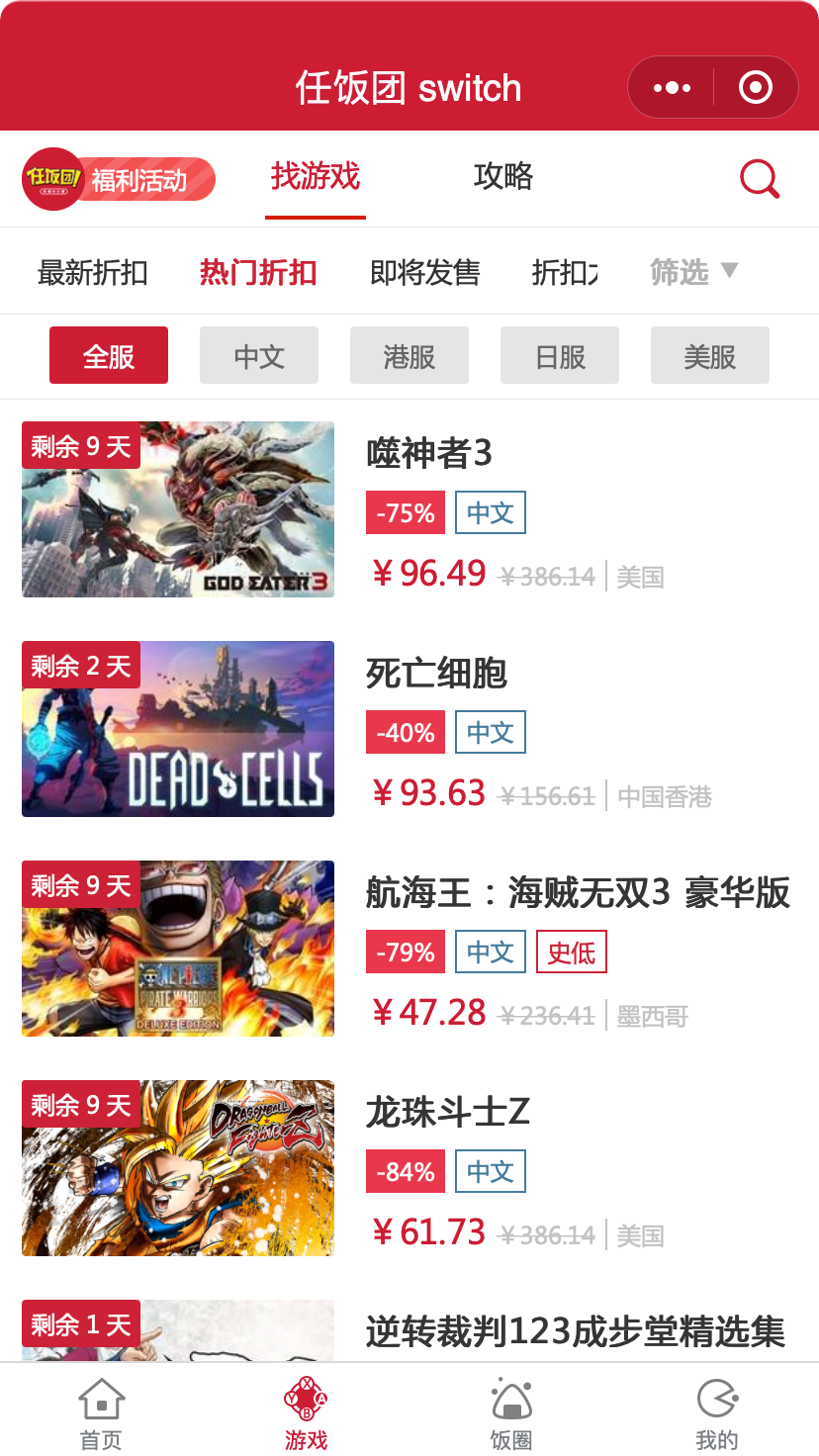 任饭团Switch小程序,为大家提供了便捷的游戏库,支持查询价格、折扣、中文、容量等各种细致入微的参数,剁手超方便!