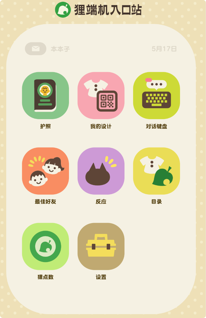动森模块的UI和游戏里的手机长得非常像,用起来很有代入感。除了查看护照、好友、道具图鉴等功能外,对话键盘、反应、我的设计以及狸点数这四大功能可谓是不可或缺。