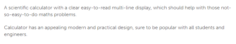 商店简介大致如下:“这台科学计算器具有清晰易读的多行数字显示,可以帮助解决那些不太容易完成的数学问题。计算器具有吸引人的现代化实用设计,一定会受到所有学生与工程师的欢迎。”