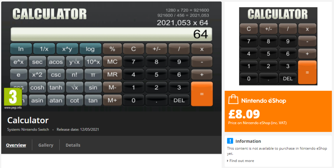 而且不像电脑与手机那样随设备免费赠送计算器程序,Switch的这款计算器应用是要收费的。计算器在美区商店售价9.99美元(人民币64.32元),而英国/爱尔兰区售价8.09英镑(人民币73.53元)。