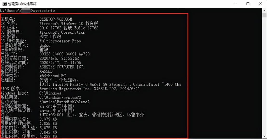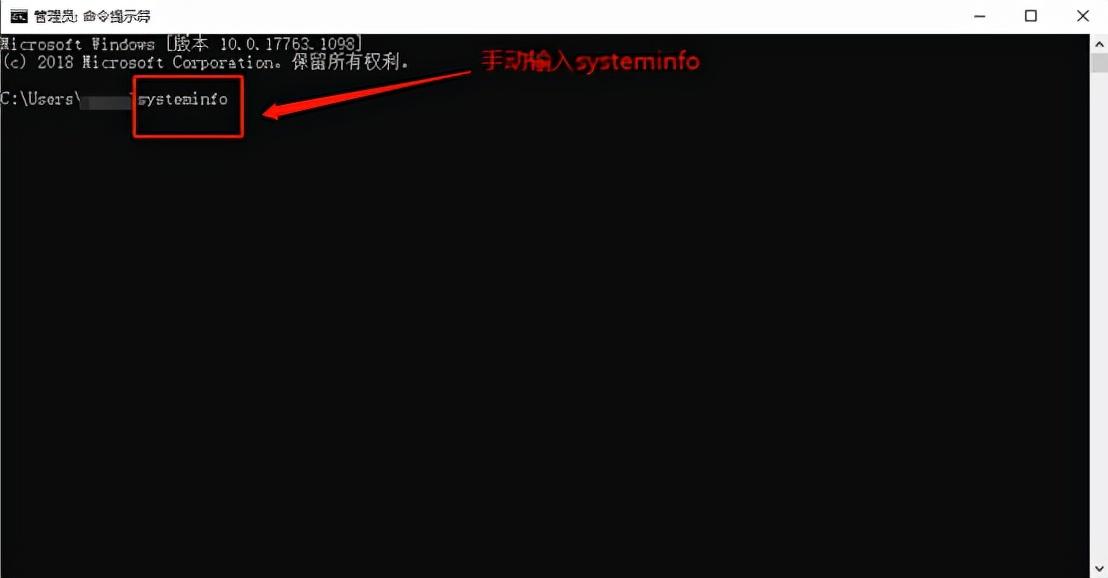 此时会出现管理员:命令提示符对话框,这里需要手动输入“systeminfo”,输入完毕后,按下Enter键。