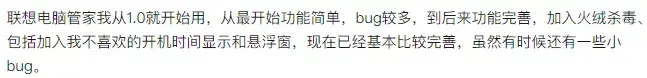 但就我们观察到的,似乎只有联想电脑管家能同时做到功能强大+公开下载+口碑不错这三点。