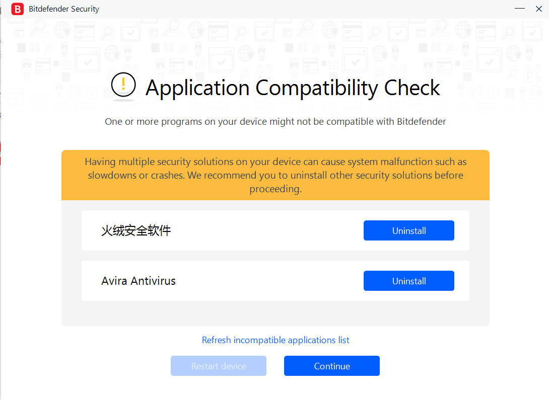 但需要注意的是,比特梵德安装需要卸载电脑除了windows防火墙之外的一切安全软件,如我图中的火绒和小红伞,卸载后需要重启电脑才可以继续安装。
