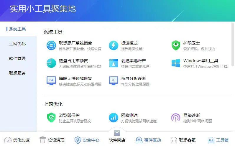 实际上联想电脑管家具备 360 或腾讯电脑管家大半的功能,比如内存加速、垃圾清理、病毒扫描、驱动更新、软件商店、上网工具箱等等。