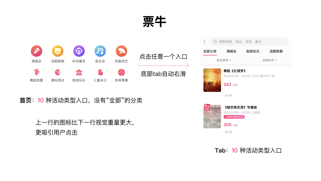 也许票牛是想要突出强调上面的热门演出类型,但是这里容易引起用户的疑惑,明明都是演出类型,为什么要做差异化?而且视觉上的不一致带来一种不舒服不和谐的感觉。