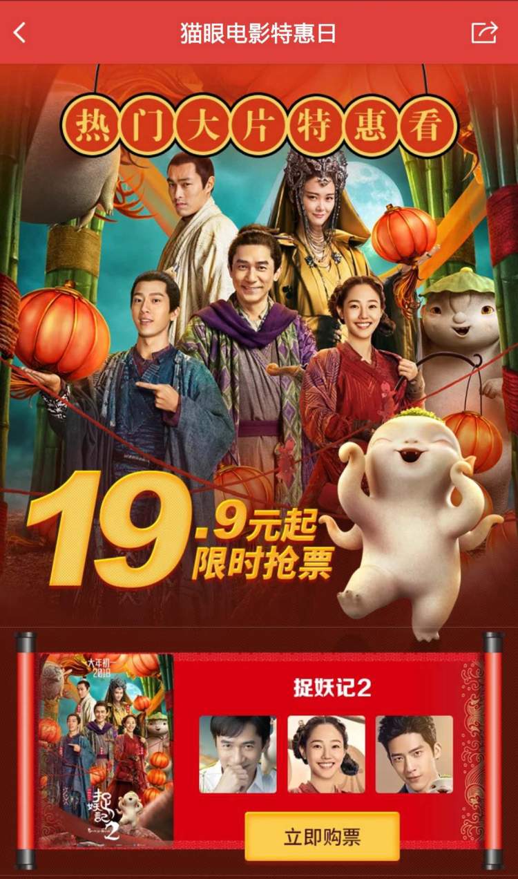 但比较好笑的是,《捉妖记2》、《红海行动》、《唐人街探案2》全上海只有三家电影院是19.9元,《熊出没·变形记》全上海只有一家电影院一个场次是19.9元,《泡芙小姐》2月16日不售票,《西游记女儿国》的实际优惠时间和活动说明时间不一致。猫眼,卒。
