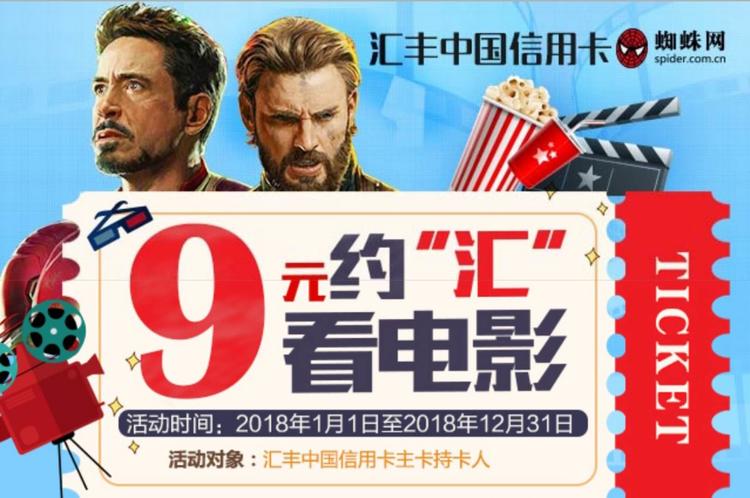 汇丰银行信用卡用户当月累计消费2888元人民币或等值美元,次月可在权益平台上兑换2张9元/张的观影券兑换码, 用于在蜘蛛网上购买电影票。