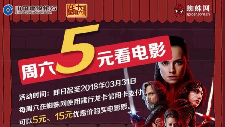 打开蜘蛛网App,你会发现诸多和信用卡合作的优惠活动。其中知名度最高的是”5元看电影“,只要你是建行龙卡信用卡用户,就能在每周六上午10点以5元的价格抢购电影票。 手速一定要快,5元票只有500张,售完即止,接下来还有4000张15元票,同样买到就是赚到。