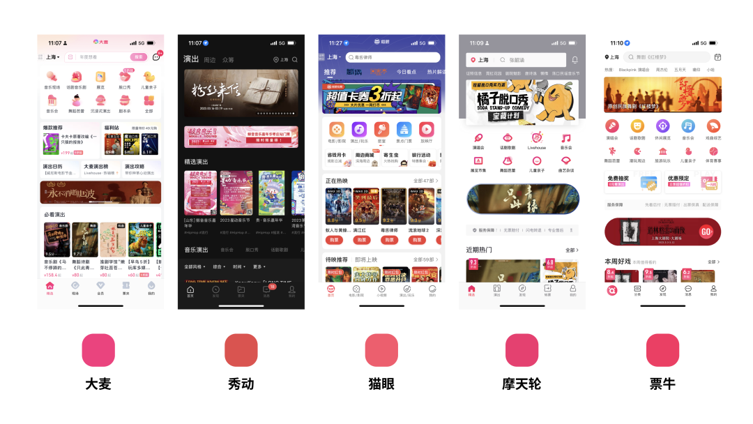 品牌色可以代表一个App的整体调性,给用户一个初步的印象,对于票务软件的现场文化娱乐,它的受众青少年群体居多,年轻活力是这些APP普遍想要传达的气质。
