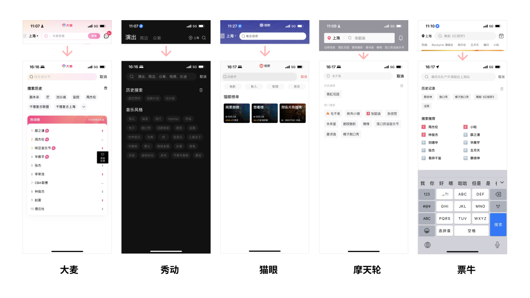 票牛 :首页展示“固定搜索热词 + 搜索框下方罗列热搜关键词”,点击搜索框区域,进入搜索界面后,如果不输入任何内容直接搜索,出来的是热词结果,手动输入关键词,会实时自动完成搜索操作;搜索界面提供“历史记录”和“搜索推荐”。