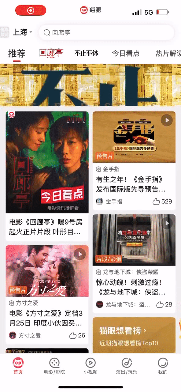 2)在Feed流区域之前,会展示一个电影海报的局部,当用户连续下拉或者上滑时,就像是手执镜头一样上下扫动,通过这样的方式能够看到一个完整的海报,是很新奇的体验,在寸土寸金的首页,开拓了运营区域。