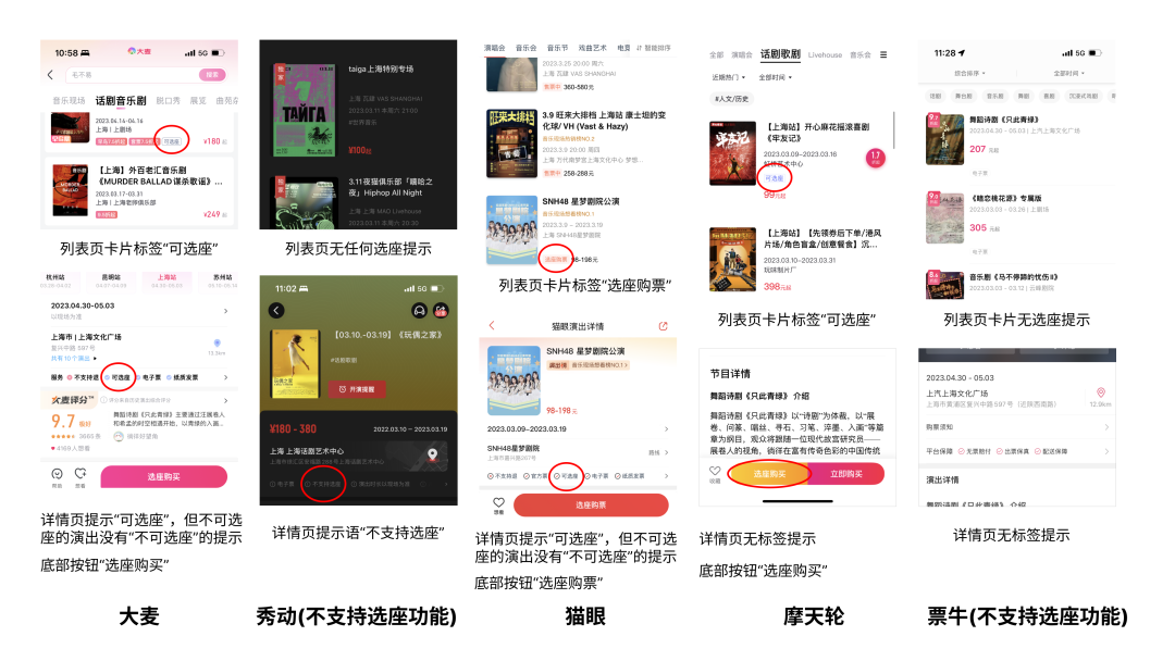 大麦: 在演出列表界面,卡片标签“可选座”;在详情页首屏,在演出时间地点下方展示“可选座”标签,底部按钮为“选座购买”。秀动: 不支持选座,根据票档随机分配座位。对于不能选座这个信息,秀动仅仅在详情页面标注出来,不容易发现。猫眼: 在演出列表界面,卡片标签“选座购票”;在详情页首屏,在演出时间地点下方展示“可选座”标签,底部按钮为“选座购票”。摩天轮: 在演出列表界面,卡片标签“可选座”;在详情页,无标签提示,但是底部按钮,比不可选座新增了一个,非常明显了。票牛: 列表和详情页都没有不可选座的提示,知道订单支付也没有任何不可选票的提示。2. 打折信息