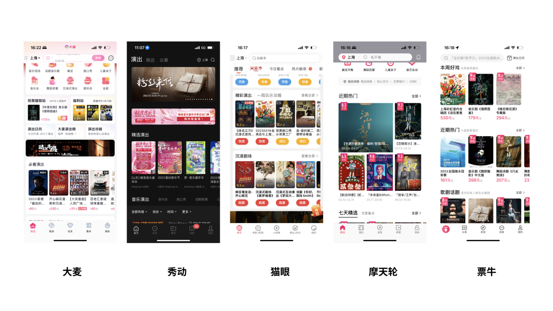 大麦(13种):抢票播报站、福利站、演出日历、大麦演出榜、演出攻略、必看演出、即将开售、预售早鸟、你想看的、24小时演出、为你推荐(Feed流 )、高分榜、周末约。秀动(1种):精选演出。摩天轮(13种):近期热门、七天精选、月度看点、超值精选、节目榜单、艺人榜单、热门场馆、演唱会、话剧歌剧、爱看展、音乐会、体育赛事、为你推荐。猫眼(7种):今日必抢、七日精选、月度看点、精选榜单、品牌馆、大咖新动态、为你推荐(Feed流)。 票牛(12种):本周好戏、近期热门、歌剧话剧、绝美舞剧、艺术展览、Live看现场、心动音乐会、欢乐喜剧、推荐(Feed流) 、榜单、合辑、大牌。6. Feed流区(信息流)