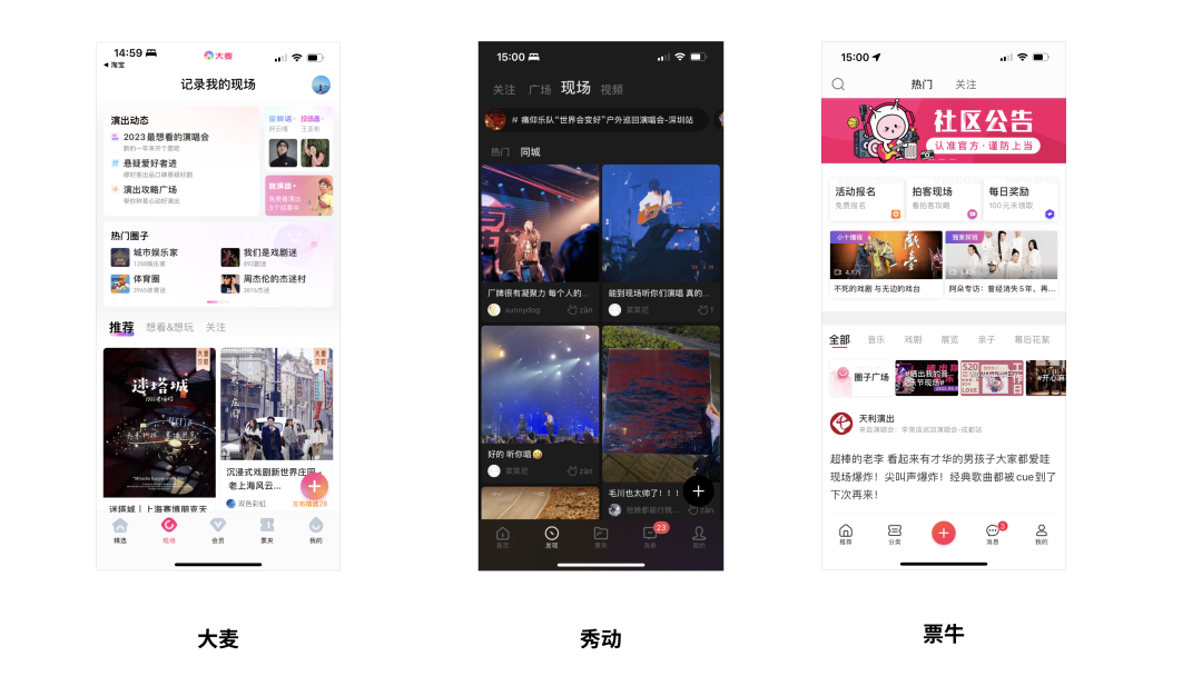 目前,大麦的“现场”,票牛&秀动的“发现”,都是专门的用户社区模块。