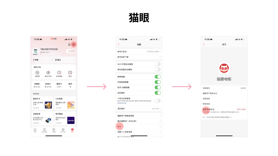目前只有一个地方可以找到客服入口,并且只有电话形式,没有在线的形式:“我的”-“设置”-“关于”-“猫眼客服电话”。这个入口藏的比较深,用户不容易找到。