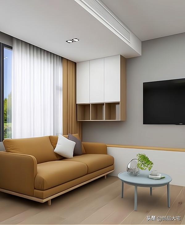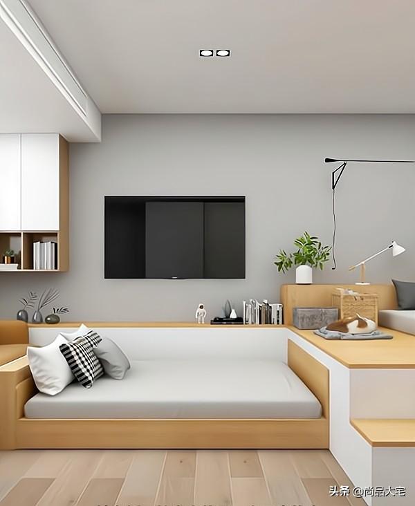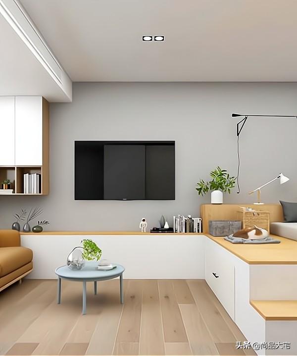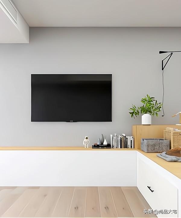 靠墙延伸出地台做电视柜,下方可以设计成收纳柜。电视背景墙没有复杂的设计,直接在墙面上安装电视。