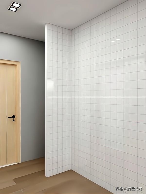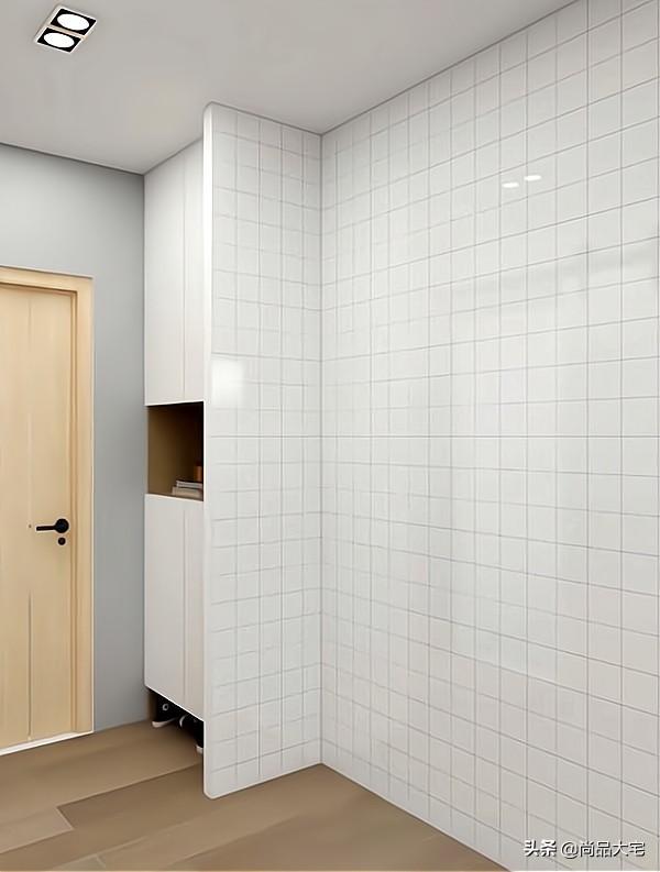 在隔出的小空间中,设计到顶鞋柜,鞋柜中间和下方留空,方便使用。中间的隔墙和旁边墙面用白色格子墙砖装饰,方便清洁的同时也可以起到延伸视觉空间的效果。