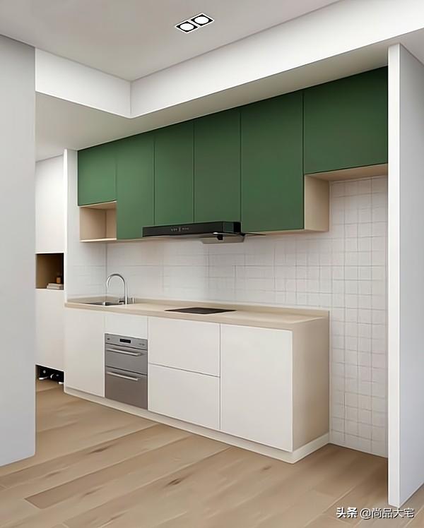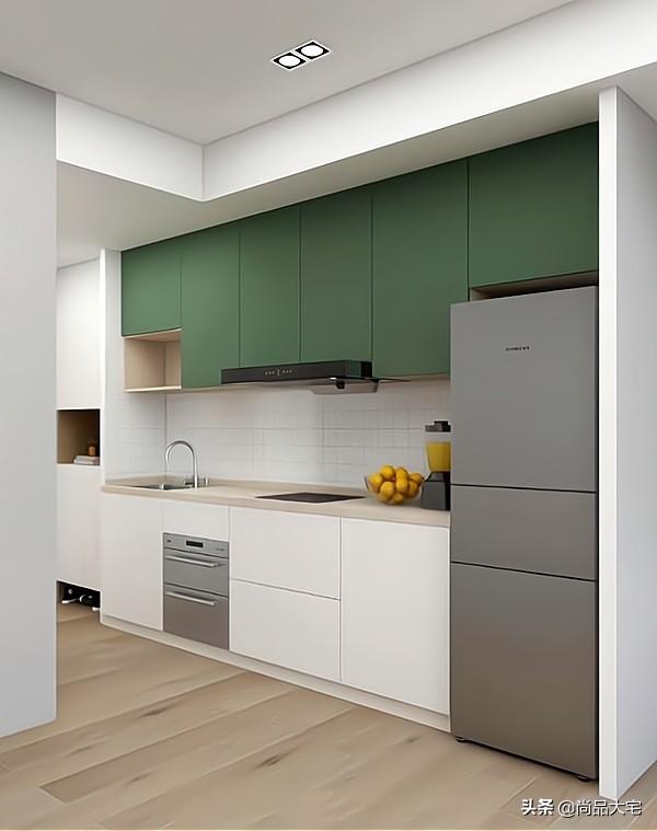 绿色的吊柜门,给小厨房增加了一抹亮色,让空间更有层次感。旁边预留的位置摆上冰箱,小厨房拿、洗、切、炒动线合理。