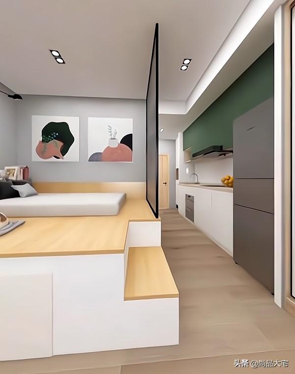 看完可能会有朋友说,厨房卧室都是开放式的,油烟是个大问题,这个问题只能用大功率的油烟机和改变烹饪模式来解决了。还有的朋友会说,冰箱靠近卧室,会有噪音影响睡眠。关于这个问题,房间面积实在有限,冰箱放哪里效果都差不多。