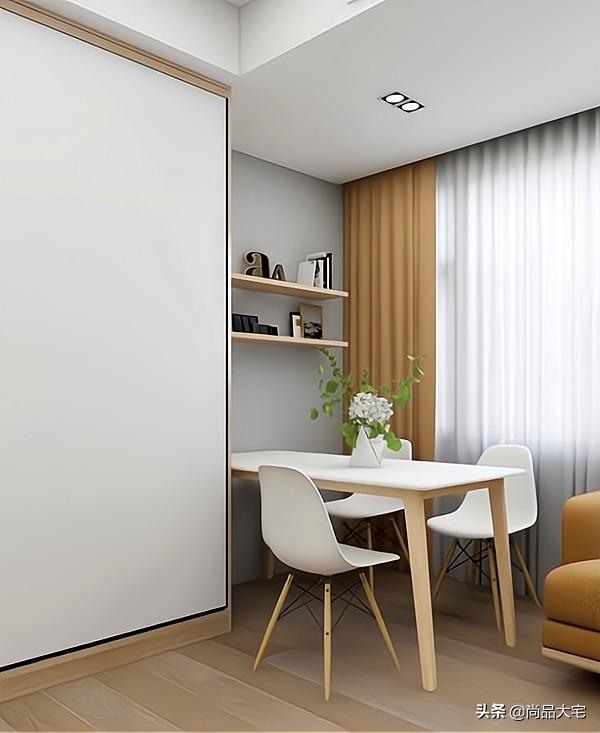 利用靠窗的这个角落摆放餐桌,旁边墙上设计置物板,增加收纳,形成一个小餐厅,满足在家用餐的需求。