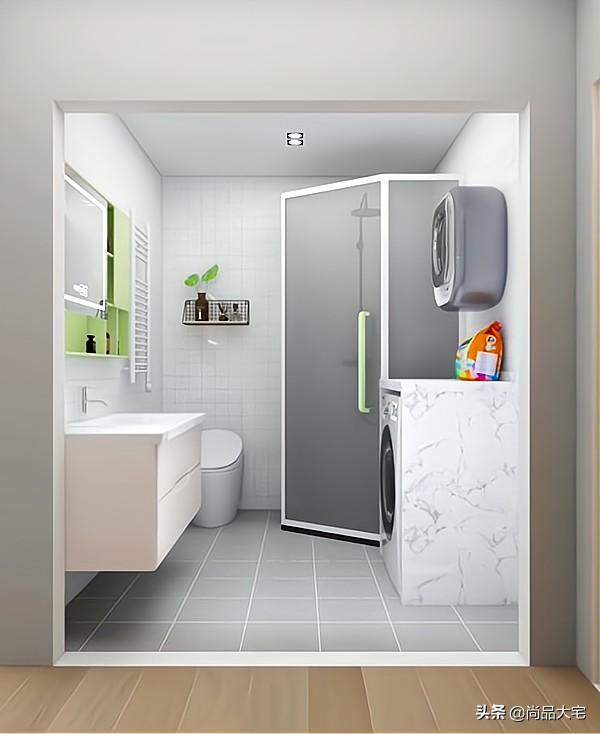 卫生间内侧一边用灰色玻璃隔出淋浴区,淋浴区设计为钻石形,节省空间。另一边摆放马桶,马桶上方设计置物架。马桶和浴室柜中间设计带烘干功能的毛巾架,浴巾、毛巾放在上面不会湿哒哒的。外侧一边设计浴室柜,浴室柜悬空设计,防潮好打理。另一侧砌台面嵌入洗衣机,上方再设计一个壁挂式洗衣机,大人孩子的衣服分开洗。