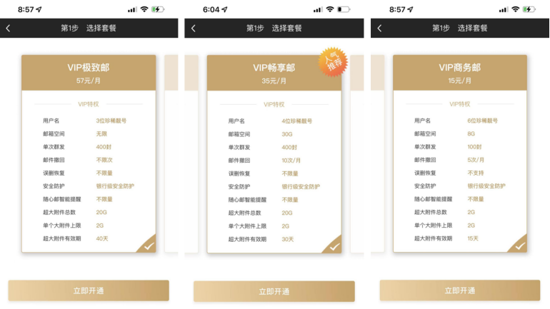 3. 看自己喜欢哪个就勾选哪个套餐,区别在于邮箱名字长度、容量、邮件群发数量。