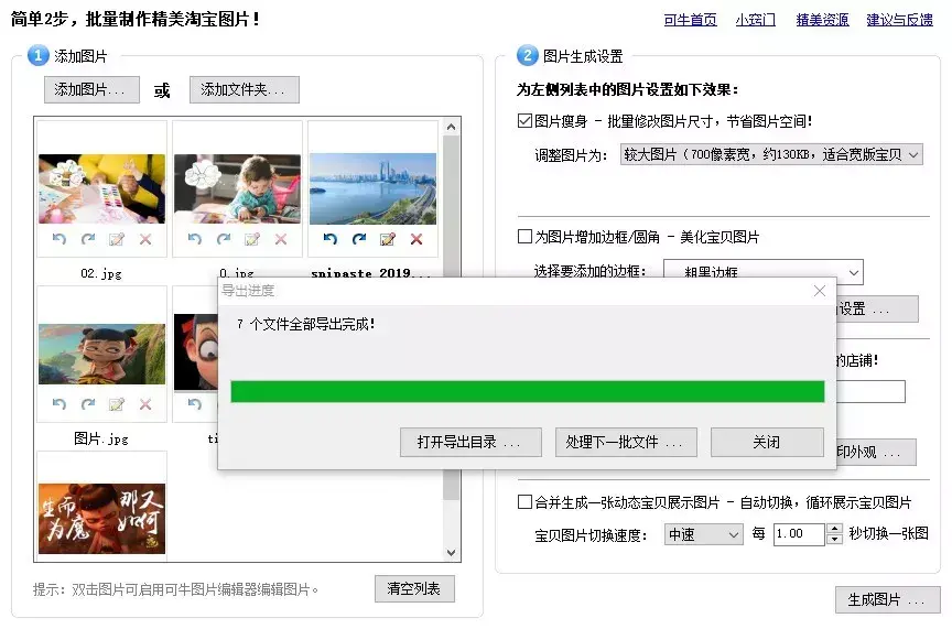 可牛淘宝图片助手是可牛影像出口的一款淘宝图片制作工具,可以批量压缩图片尺寸,一键生成适合淘宝店铺的图片;还能批量添加水印、边框,使宝贝图片更加漂亮!