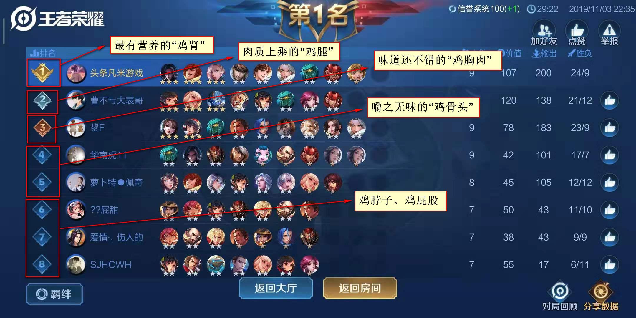 按照排名先后来看,第一名就是全体玩家都热切期盼的“鸡肾”,第二名即是玩家都想争取的“鸡腿”,而第三名当然就是玩家退而求其次的“鸡胸”肉,第四名都是写难于嚼动的骨头了,至于后四名一律是“鸡屁股”,谁都拒绝吃的呢!下面来张“全鸡写照”!