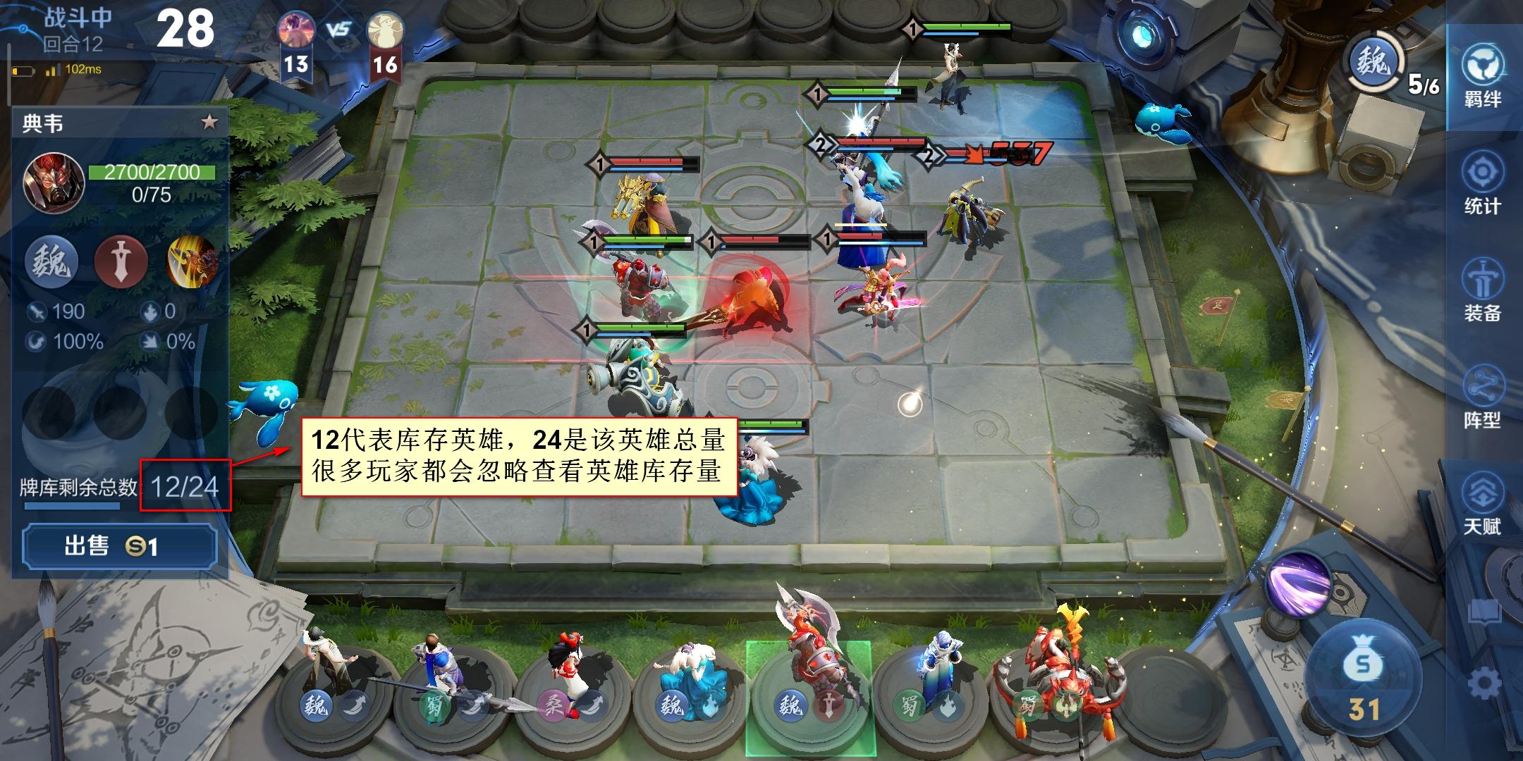 六、要经常看看该英雄的库存量,后期很有可能你等着要升二三星的英雄库存量是0,而你还在苦等发牌,预留区还浪费两三个棋子席位,又没及时调整英雄,非常吃亏。中后期往往就差那么一两个英雄的等级差异被对面一波高分带走。