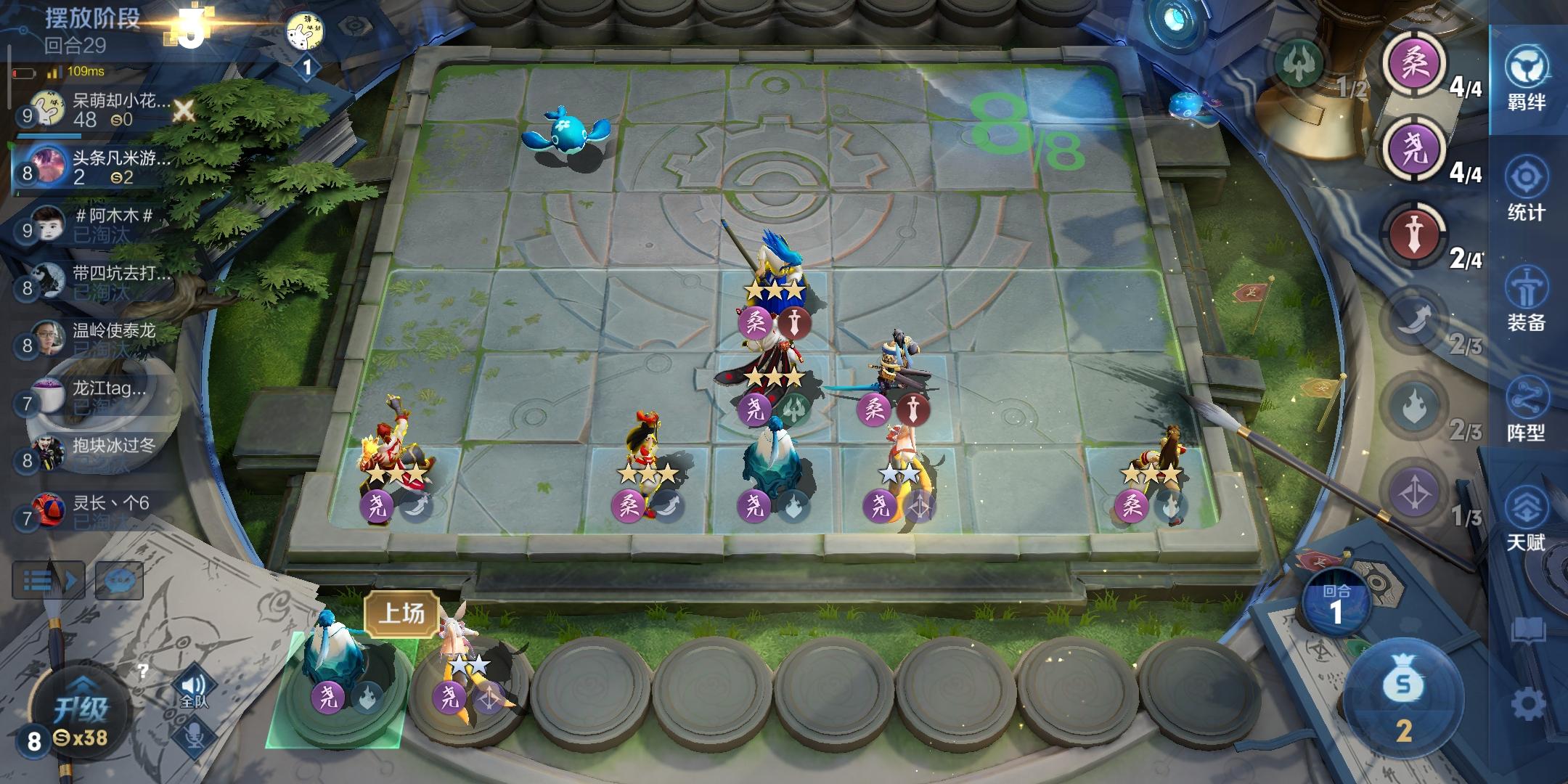 七、升级人口之后,如何安排预留区或者出售区的棋子也是一个很重要的环节,这个时候就要留意棋盘上的棋子已经激发的羁绊,哪个羁绊缺一个人口的,就优先选择对应阵营的棋子,比如场上刚好差一个刺客就能激发3刺客羁绊技能,那就上刺客类型的棋子。