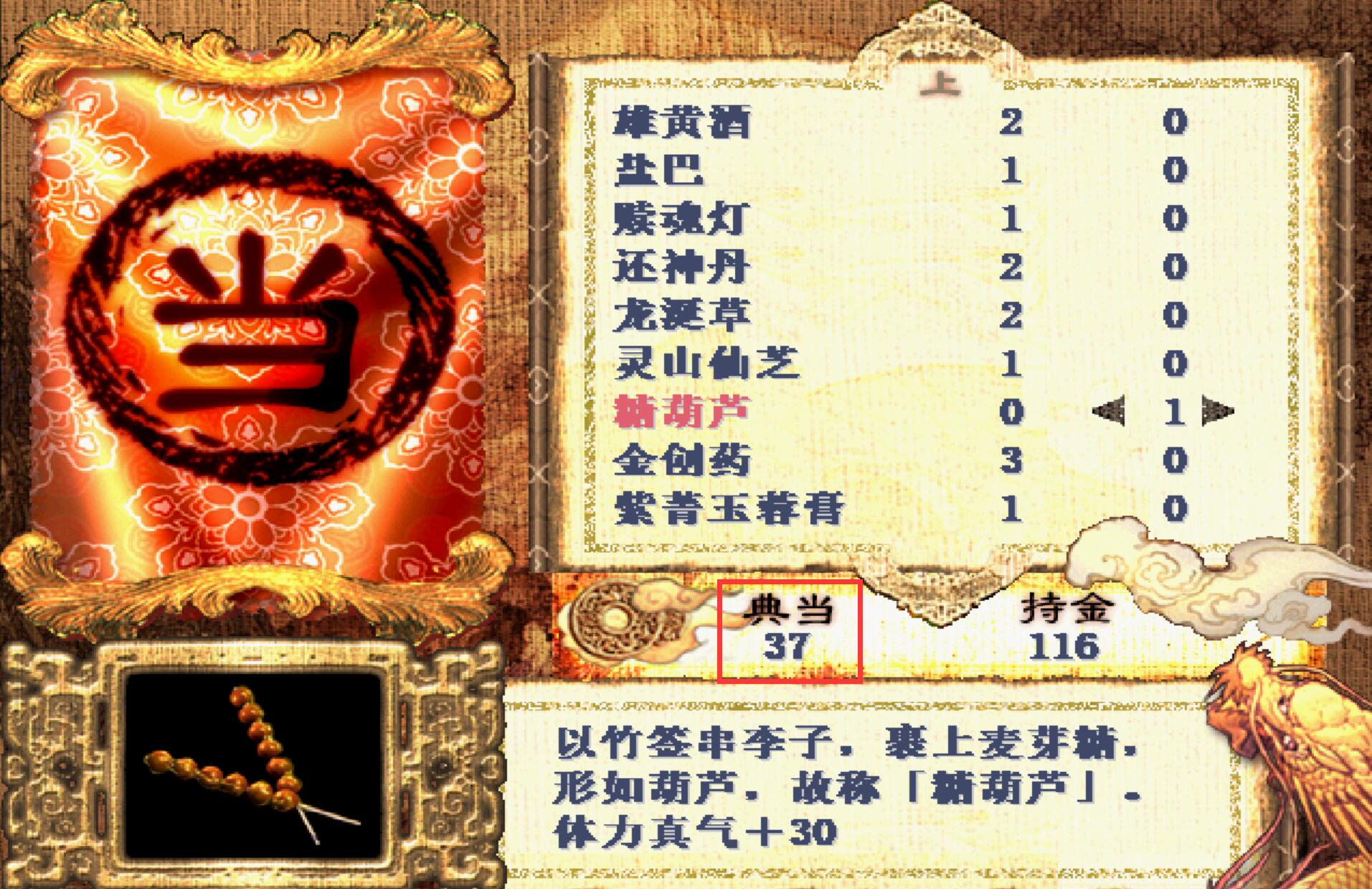 此时我们去买一只糖葫芦,发现用掉了20文(游戏中不会显示价格)。然后再进入当铺里面当掉,你就会发现卖出去的价格是37文。