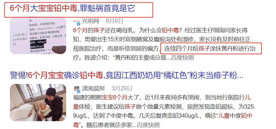 比如之前长沙一个6个月大的孩子就经常的抽搐,送到医院的时候医生发现,原因是家长用土方黄丹粉给孩子擦皮肤,黄丹粉里面含有铅 ,导致孩子铅中毒。